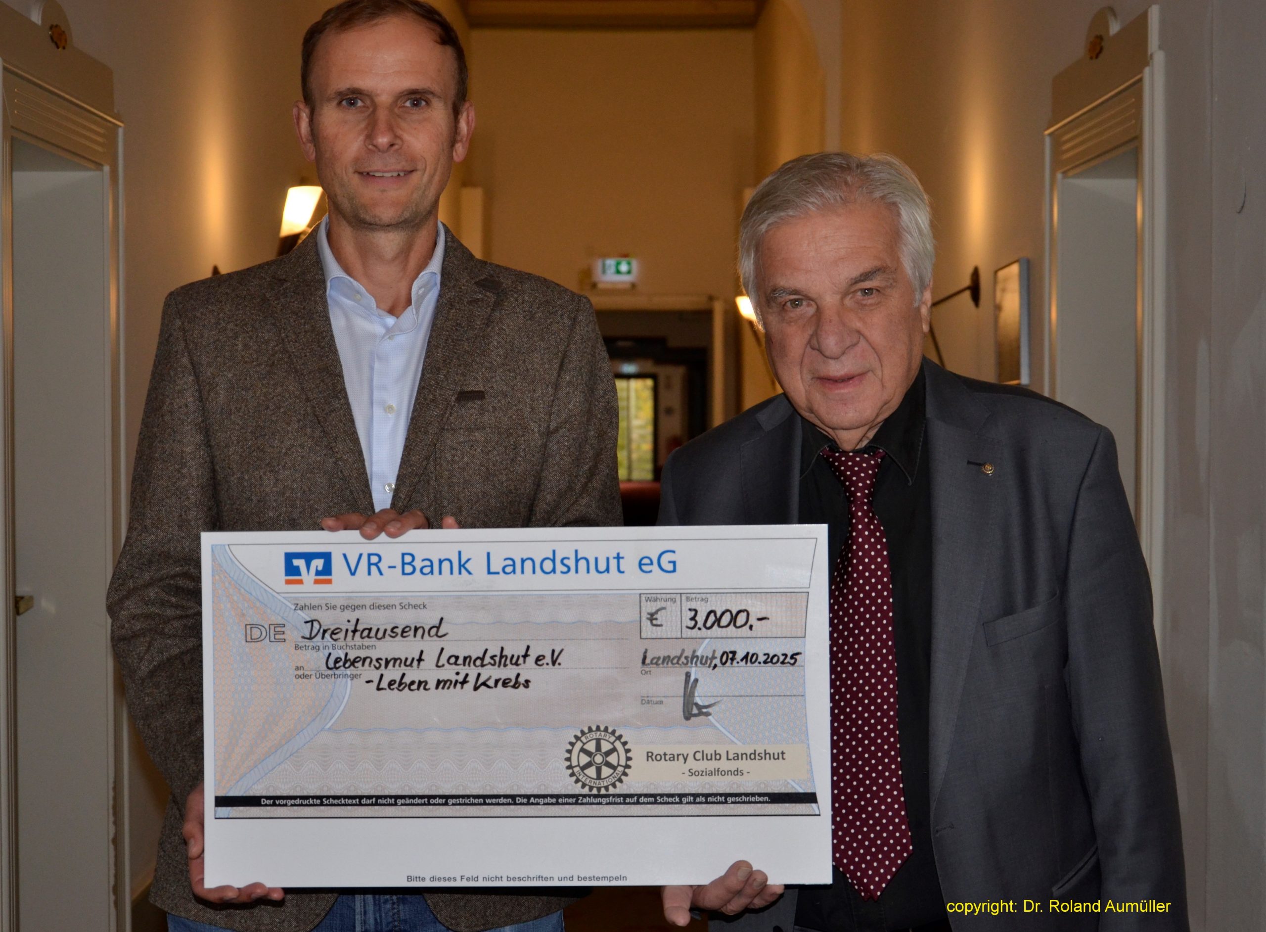 Eine Spende in Höhe von 3000 Euro übergibt Hans-Werner Hartl, Präsident des Rotary Clubs Landshut (rechts im Bild), an Priv.-Doz. Dr. Christian Bogner, Vorsitzender von lebensmut Landshut und zugleich Chefarzt Onkologie am Klinikum Landshut. Foto: Dr. Roland Aumüller Rotray Club Landshut.