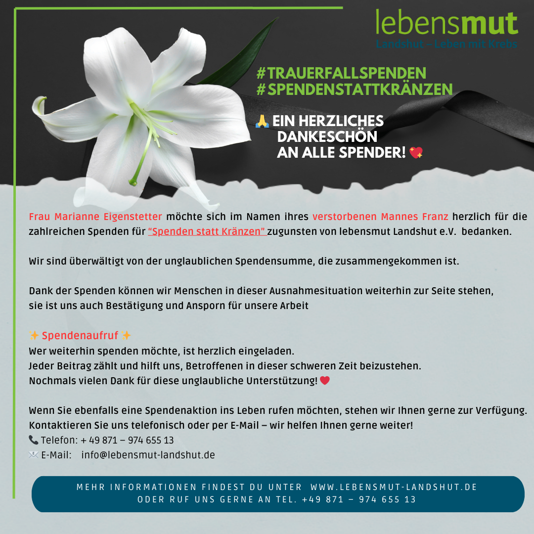 Wir dürfen uns im Namen von Frau Marianne Eigenstetter für die zahlreichen Spenden anlässlich ihres verstorbenen Mannes Franz bedanken.