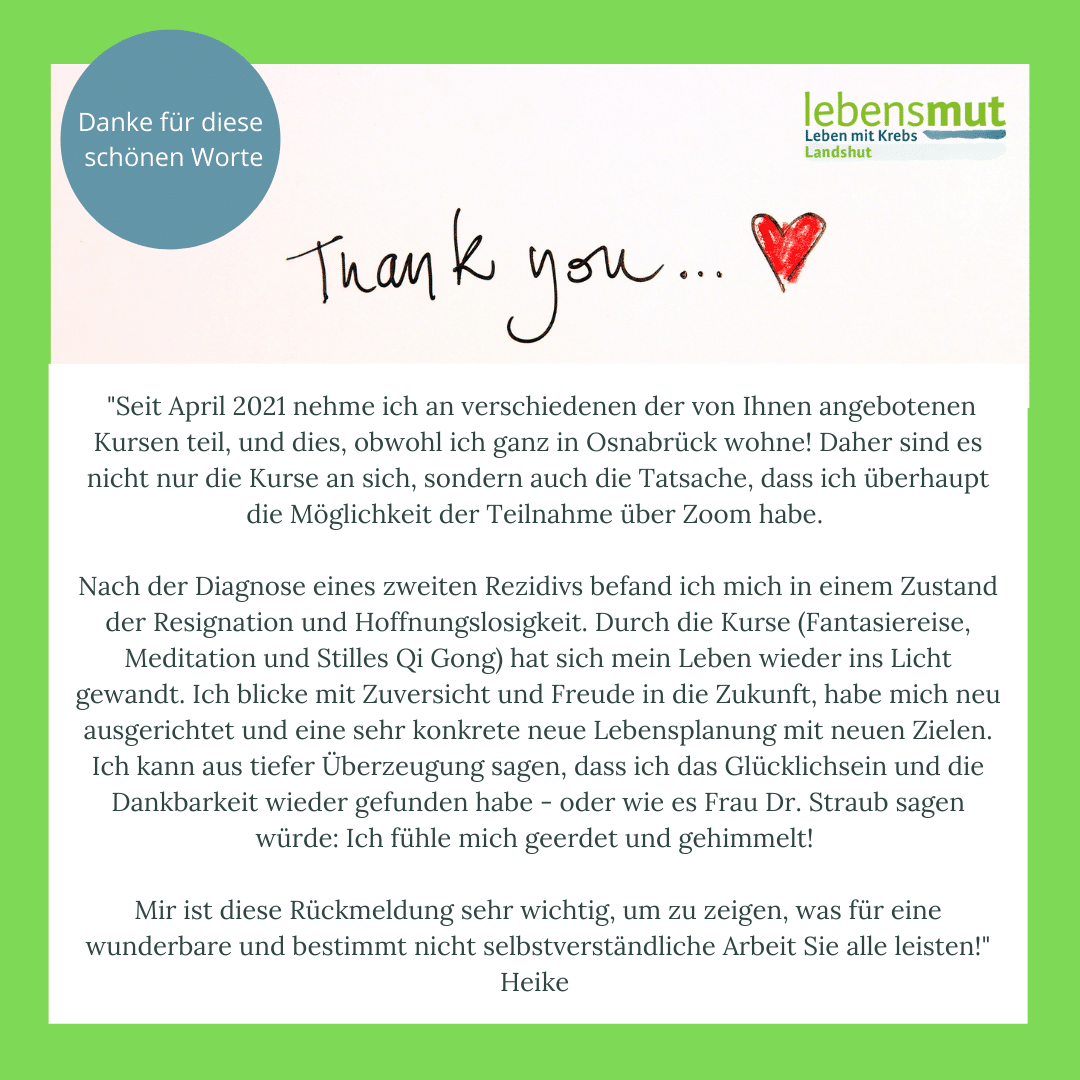 „Seit April 2021 nehme ich an verschiedenen der von Ihnen angebotenen Kursen teil, und dies, obwohl ich ganz in Osnabrück wohne! Daher sind es nicht nur die Kurse an sich, sondern auch die Tatsache, dass ich überhaupt die Möglichkeit der Teilnahme über Zoom habe. Nach der Diagnose eines zweiten Rezidivs befand ich mich in einem Zustand der Resignation und Hoffnungslosigkeit. Durch die Kurse (Fantasiereise, Meditation und Stilles Qi Gong) hat sich mein Leben wieder ins Licht gewandt. Ich blicke mit Zuversicht und Freude in die Zukunft, habe mich neu ausgerichtet und eine sehr konkrete neue Lebensplanung mit neuen Zielen. Ich kann aus tiefer Überzeugung sagen, dass ich das Glücklichsein und die Dankbarkeit wieder gefunden habe – oder wie es Frau Dr. Straub sagen würde: Ich fühle mich geerdet und gehimmelt!